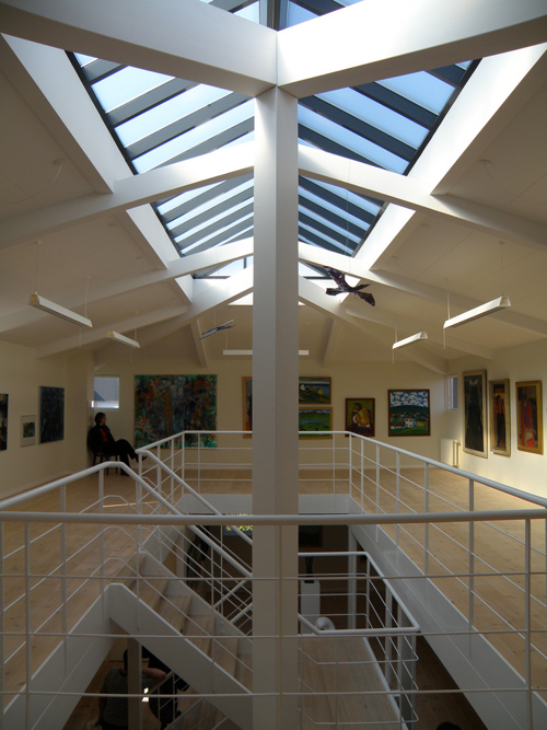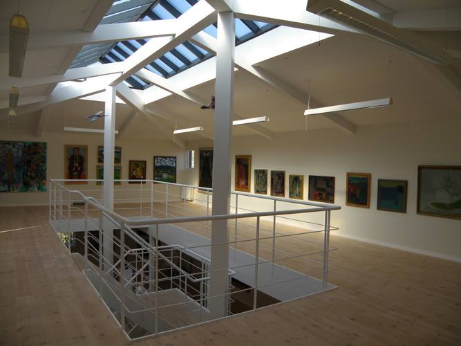 The Gallery, designed by the famous architect Palle Gregoriussen, is a timber building with two floors each 120 m2. The work was commenced in July 2005 and was completed on the 10th December same year on Mr Sofus Olsens 92th birthday. Mr Olsen dedicated the Gallery – funded by himself – and the art collection to the Municipality of Sandoy. A noble gesture and a suitable memory of the now late Sofus Olsen.