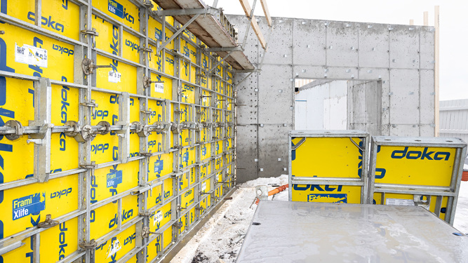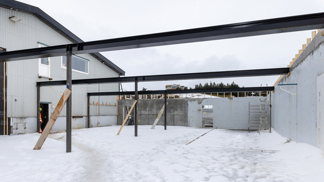 Í løtuni verður víðkað og vælt um fyrisiting, goymslu og kølirúm, og í næstu viku verður klárt at tekja. Vaksast skal eisini um handilshølini, og har eru flestu veggir longu uppkomnir.