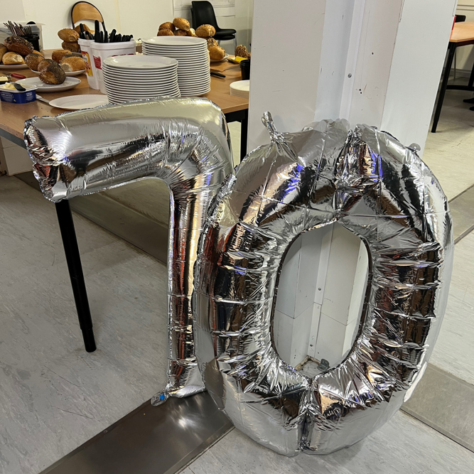 Í morgun var hugnaløta í Árnafirði, har Articon ger tunlar fyri Landsverk. Tað var Heðin Olsen, arbeiðsmaður á verklagsdeildini hjá Articon, sum fyllur 70, og tað skuldi feirast.