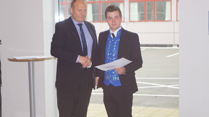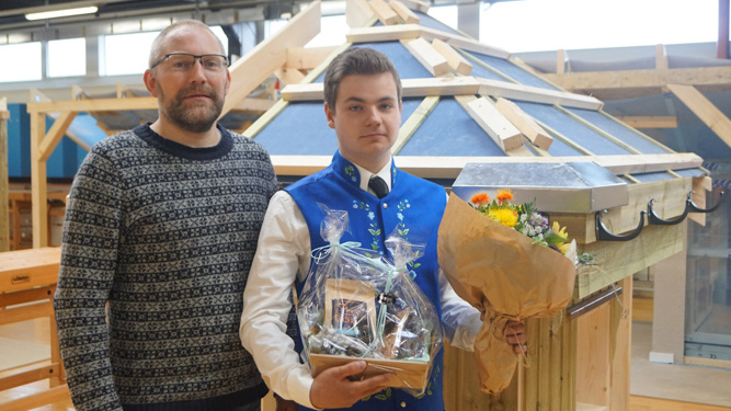 Í juni mánaði varð Markus Olsen, timburlærlingur, liðugur við sveinastykkið. Í hesum sambandi var prógvhandan á Tekniska skúla í Klaksvík seinnapartin í dag.