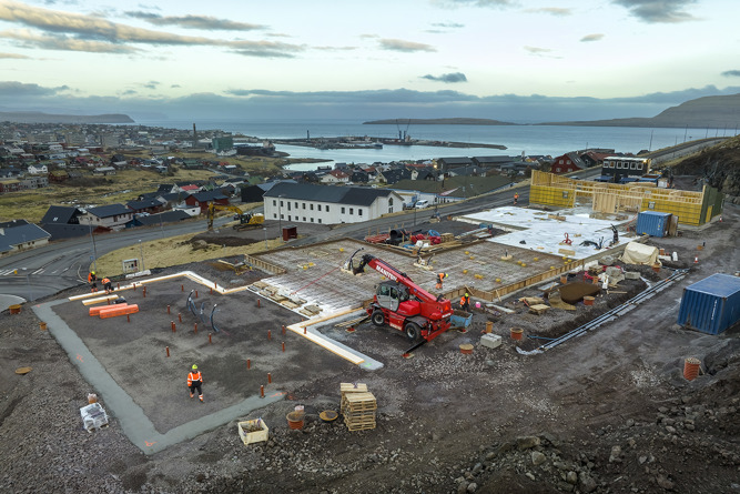 Veðrið hevur ikki verið til nakað smíð í vetur, men nú várar, og arbeiðið upp á nýggja sambýlið í Reynstúni á Argjum gongur væl. Stoypingin er komin í helvt, og í dag vórðu útveggirnir á fyrstu lonini reistir.