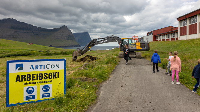 Hósdagin loysti Marita Sumberg, borgarstjóri á Viðareiði, fyrsta flagið til tænastudepilin, sum viðoyingar nú fara at byggja sær. Depilin fer at hava barnagarð og eldrasentur undir somu lon og verður næsti granni hjá verandi skúla. Soleiðis kunnu ættarliðini í bygdini savnast. Articon skal gera økið byggibúgvið.